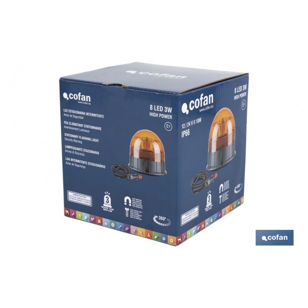 Luz led estacionaria de color naranja con imán y posibilidad de atornillado para mayor sujeción. Dispone de cable con enchufe a toma de mechero de vehículos. Esta luz tiene tres modos de iluminar: flash / flash doble / rotación, para satisfacer diferentes necesidades. Luz con 8 leds de 3 W de alta potencia en 18 watios con posibilidad de uso en 12 (coches/tractores) o 24 voltios (camión y bus). La luz estacionaria naranja está equipada con conexión de alto rendimiento, debe colocarse en la parte alta del vehículo. Las luces intermitentes tienen un papel de advertencia para avisar para reducir accidentes. Es adecuada para señalización en el techo de un vehículo, bomberos, maquinas urbanas, barredoras, camión, etc. Cuenta con protección IP66 y con homologación ECE R65, ECE R10, CE y RoHs (ECE R10 N. º: E9* 10R06/02*23732*00 y ECE R65 N. º: E9*65R00/11*11000*00). La carcasa está hecha de material ABS duradero y es cristalina para aportar un brillo intenso. Medidas de 130 mm de altura total y 125 mm de ancho.