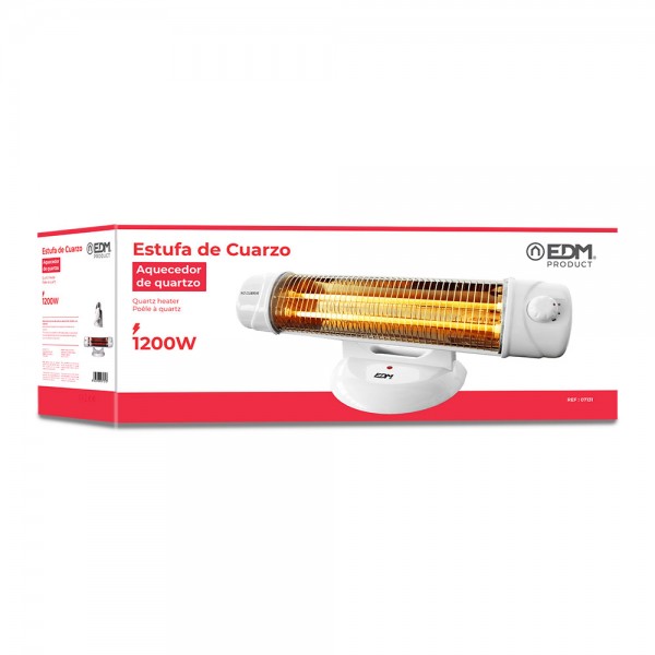 ESTUFA DE CUARZO - SISTEMA DE SEGURIDAD ANTI-VUELCO - CON 2 BARRAS DE CUARZO - EMISION INSTANTANEA DE CALOR - REFLECTOR PROTEGIDO - BASE ENTIDESLIZANTE. REJILLA DE SEGURIDAD - PROTECTOR DE SOBRECALENTAMIENTO - RECAMBIO TUBO: REF. 07904 2 NIVELES DE POTENCIA - 600-1200W - DIMENSIONES: 55,5x15x20cm (ancho/fondo/alto)- 240-240V - 50Hz - EDM