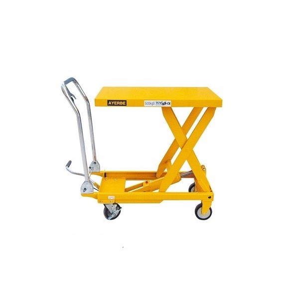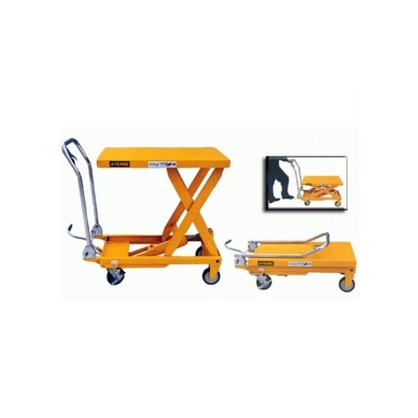 Mesa elevadora con diseño robusto para un trabajo intensivo. Gran resistencia y fiabilidad. Peso ligero. Pintura de alta calidad. Sistema de freno por pedal. Sistema de elevación por pedal. Conforme con normativas: CE, GS y TÜV.