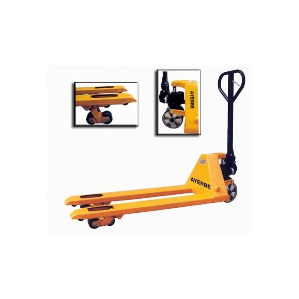 Transpaleta Ayerbe AY-2500-THV para el transporte de cargas pesadas en la industria. Con una capacidad máxima de 2500 Kg. y ruedas de vulkollan. Incluye válvula de seguridad por sobrecarga, sistema de descenso controlado y piston cromado.