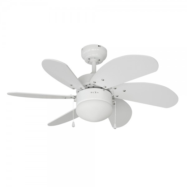 VENTILADOR DE TECHO MODELO ARAL. COLOR BLANCO. POTENCIA: 50W ASPAS: Ø76cm 3 VELOCIDADES (INTERRUPTOR TIRADOR) CAUDAL DE AIRE 4409m³/h AC-220-240V 50Hz LUZ (1xE14 MAX. 60W MAX. 8,7cm NO INCLUIDA. INTERRUPTOR TIRADOR) 6 ASPAS IP20 EDM