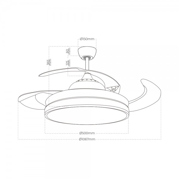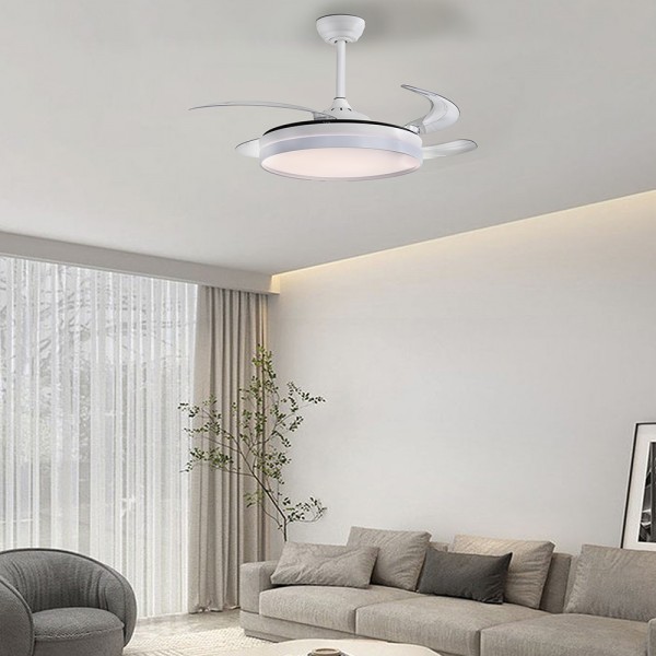 VENTILADOR DE TECHO MODELO ROSS CON 4 ASPAS RETRÁCTILES DE ABS TRANSPARENTES; CON MOTOR DC, 36 W, 220-240 V 50HZ, IP20; TIPO DE LUZ: LUZ CÁLIDA 3000 K, LUZ DÍA 4000 K, LUZ FRÍA 6500 K, 4100 LM, 72 LEDS; 6 NIVELES DE POTENCIA; 2 MODOS: CON EL MODO VERANO LAS ASPAS GIRAN EN SENTIDO AL CONTRARIO A LAS AGUJAS DEL RELOJ CREANDO UN FLUJO DE AIRE DESCENDIENTE, PRODUCIENDO UNA BRISA FRESCA. CON EL MODO INVIERNO LAS ASPAS GIRAN EN EL SENTIDO DE LAS AGUJAS DEL RELOJ CREANDO UN FLUJO DE AIRE ASCENDIENTE Y HACIENDO CIRCULAR EL AIRE CALIENTE HACIA BAJO. CON POSIBILIDAD DE INSTALACIÓN EN 2 ALTURAS DISTINTAS, CONTIENE 2 TUBOS DE MONTAJE: 12,5 cm Y 25 cm. CON CONTROL REMOTO. COLOR BLANCO MATE. MEDIDA Ø107 cm; CAUDAL DE AIRE: 3500 m³/h